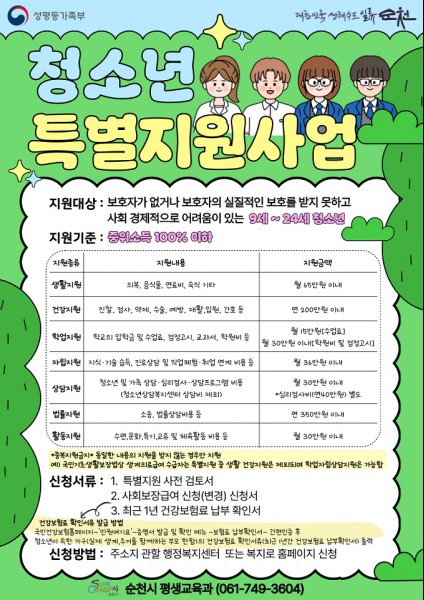 ¼øÃµ½Ã, À§±âû¼Ò³â Ưº°Áö¿ø ´ë»óÀÚ ¸ðÁý - »çȸ¡¤°æÁ¦Àû ¾î·Á¿òÀÌ ÀÖ´Â 9¼¼~24¼¼ û¼Ò³â Áö¿ø - ¼øÃµ½Ã´Â û¼Ò³âÀÇ °Ç°ÇÑ ¼ºÀåÁö¿ø ¹× ÀÚ¸³À» Áö¿øÇϰíÀÚ ¿À´Â 27ÀϱîÁö ¡®Ã»¼Ò³â Ưº°Áö¿ø »ç¾÷¡¯ ´ë»óÀÚ¸¦ ¸ðÁýÇÑ´Ù°í ¹àÇû´Ù. Ưº°Áö¿ø »ç¾÷ÀÇ ´ë»óÀº 9¼¼ ~ 24¼¼ÀÇ Ã»¼Ò³â Áß ¡âºñÇࡤÀÏÅ» ¿¹¹æÀ» À§ÇÑ Áö¿øÀÌ ...