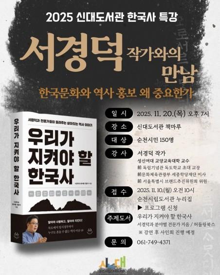 ¼øÃµ½Ã(½ÃÀå ³ë°ü±Ô)´Â ¿À´Â 20ÀÏ(¸ñ) ¿ÀÈÄ 7½Ã, ¼øÃµ½Ã¸³½Å´ëµµ¼°ü Ã¥¸¶·ç¿¡¼ ¼°æ´ö ¼º½Å¿©ÀÚ´ëÇб³ ±³¼ö¸¦ ÃÊÃ»ÇØ ¡®Çѱ¹ ¹®È¿Í ¿ª»ç È«º¸, ¿Ö Áß¿äÇѰ¡¡¯¸¦ ÁÖÁ¦·Î °¿¬À» °³ÃÖÇÑ´Ù.