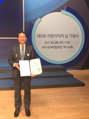 ÇàÁ¤¾ÈÀüºÎ(Àå°ü ±èºÎ°â)´Â 2017³â 10¿ù 26ÀÏ ¿©¼ö ¿¢½ºÆ÷¿¡¼ ¿¸° ¡®Á¦ 5ȸ Çѱ¹Áö¹æÀÚÄ¡ÀÇ ³¯¡¯À» ±â³äÇÏ¿© À±º´Ã¶ Áö¹æºÐ±ÇÀü³²¿¬´ë »óÀÓ´ëÇ¥¸¦ Áö¹æÀÚÄ¡¹ßÀü À¯°øÀÚ·Î ¹®ÀçÀδëÅë·É ǥâÀ» ¼ö¿©Çß´Ù.