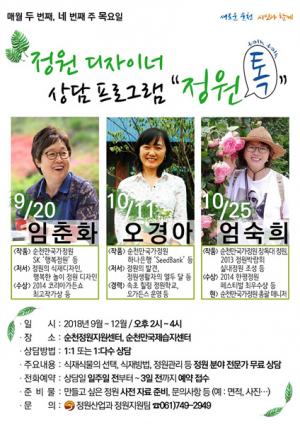 ¼øÃµ½Ã°¡ Á¤¿ø»ê¾÷À°¼º ¹× Á¤¿ø¹®ÈÇâ»óÀ» À§ÇÏ¿© ½Ã¹Îµé¿¡°Ô Á¤¿ø µðÀÚÀÌ³Ê »ó´ã ÇÁ·Î±×·¥ÀÎ ¡®Á¤¿øÅå talk¡¯À» ¼øÃµ Á¤¿øÁö¿ø¼¾ÅÍ¿¡¼ ¿ÃÇØ 12¿ù±îÁö ¸Å¿ù µÎ ¹øÂ°, ³× ¹øÂ° ÁÖ ¸ñ¿äÀÏ ¿ÀÈÄ 2½Ã¿¡ ¿î¿µÇÑ´Ù°í Çß´Ù.