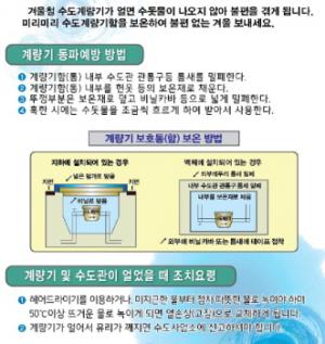 ¼öµµ°è·®±â µ¿ÆÄ ¿¹¹æÀ» À§Çؼ´Â º¸È£Åë³» Âù °ø±â°¡ À¯ÀÔµÇÁö ¾Êµµ·Ï ½ºÆ¼·Îǰ, Çå¿Ê, Çå ÀÌºÒ µî º¸¿Âµ¤°³·Î º¸È£ÇØ¾ß ÇÏ°í ¾ÆÆÄÆ® °è´Ü â¹®À» ´Ý¾Æ Âù¹Ù¶÷ À¯ÀÔÀ» Â÷´ÜÇÏ´Â º¸¿Â°ü¸®¿¡ ½Å°æÀ» ½á¾ß ÇÏ¸ç ¿µÇÏ 10µµ ÀÌÇÏÀÇ È¤ÇÑÀÌ °è¼ÓµÉ ¶§¿¡´Â °è·®±âÇÔ º¸¿Â Á¶Ä¡¿Í ´õºÒ¾î µ¿ÆÄ¿¹¹æÀ» À§ÇØ Àá½Ã ¿ÜÃâÇÒ ¶§³ª ¾ß°£¿¡ ¼öµ¾¹°À» »ç¿ëÇÏÁö ¾ÊÀ» ¶§ ¿åÁ¶³ª ¼¼¸é´ë, ½ÌÅ©´ëÀÇ ¼öµµ²ÀÁö¸¦ Á¶±Ý¾¿ Ʋ¾î ³õ¾Æ ¼öµ¾¹°À» Èê·Áº¸³»¾ß ÇÑ´Ù.