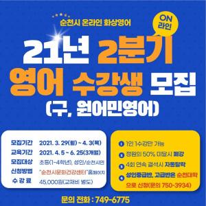 ¼øÃµ½Ã(½ÃÀå Çã¼®)´Â ½Ã¹Î¿Ü±¹¾î ¿ª·® °È¸¦ À§ÇØ ÃßÁøÇϰí ÀÖ´Â ½Ã¹Î¿Ü±¹¾î¼¾ÅÍÀÇ 2021³â Á¦2±â ¿µ¾îÈ¸È¹Ý ¿Â¶óÀÎ ¼ö°»ýÀ» 3¿ù 29ÀÏ(¿ù)ºÎÅÍ 4¿ù 2ÀÏ(±Ý)±îÁö 5Àϰ£ ¸ðÁýÇÑ´Ù.