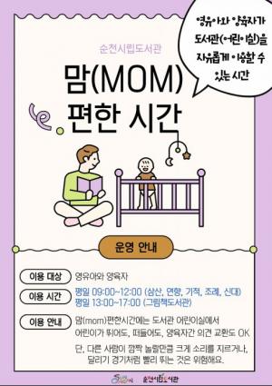 ¡®¸¾(mom)ÆíÇÑ ½Ã°£¡¯Àº ¼øÃµ½Ã¸³µµ¼°ü ¾î¸°À̽Ç(»ï»ê¡¤¿¬Ç⡤±âÀû¡¤Á¶·ÊÈ£¼ö¡¤½Å´ë)¿¡¼ ÆòÀÏ ¿ÀÀü 9½ÃºÎÅÍ 12½Ã±îÁö ¿î¿µÇϸç, ±×¸²Ã¥µµ¼°üÀº ÆòÀÏ ¿ÀÈÄ 1½ÃºÎÅÍ 5½Ã±îÁö ÀÚ·á½Ç¿¡¼ ¿î¿µÇÑ´Ù. ÀÌ ½Ã°£¿¡´Â ¾î¸°À̵éÀÌ ÀÚÀ¯·Ó°Ô ¶Ù°í ¶°µé¾îµµ µÇ°í, ¾çÀ°ÀÚ°£ ÀÇ°ß ±³È¯ µî Æò¹üÇÑ »ýȰ ¼ÒÀ½Àº Çã¿ëµÈ´Ù.
