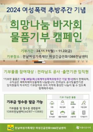Àü³²¿©¼º°¡Á·Àç´Ü ºÎ¼³ ¡¸¿©¼º±ä±ÞÀüÈ1366Àü³²¼¾ÅÍ¡¹´Â 11¿ù 28ÀÏ(¸ñ) ¿©¼ºÆø·ÂÃß¹æÁÖ°£À» ¸ÂÀÌÇÏ¿© Àü³²¿©¼º°¡Á·Àç´Ü 2Ãþ¿¡¼ Èñ¸Á³ª´® ¹ÙÀÚȸ¸¦ °³ÃÖÇÒ ¿¹Á¤ÀÌ´Ù.