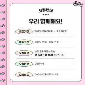 Âü¿© ½ÅûÀº ¿Â¶óÀÎ Á¢¼ö(Á¢¼öó : soda0412@korea.kr.)·Î ÁøÇàµÇ¸ç ½Åû¼, °³ÀÎÁ¤º¸µ¿ÀǼ¸¦ ¿À´Â 24ÀÏ(±Ý)±îÁö Á¦ÃâÇÏ¸é µÈ´Ù. º¸´Ù ÀÚ¼¼ÇÑ »çÇ×Àº ¼øÃµ½Ã ´©¸®Áý(https://www.suncheon.go.kr)À» ÅëÇØ È®ÀÎÇÒ ¼ö ÀÖ´Ù.
