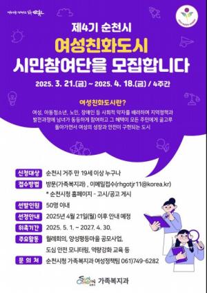 [»çȸ/°æÁ¦] ¼øÃµ½Ã, ¡®Á¦4±â ¿©¼ºÄ£Èµµ½Ã ½Ã¹ÎÂü¿©´Ü¡¯ ³»´Þ 18ÀϱîÁö ¸ðÁý
