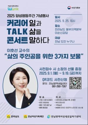 Àü³²¿©¼º°¡Á·Àç´Ü Àü³²±¤¿ª»õÀϼ¾ÅÍ´Â 2025 ¾ç¼ºÆòµîÁÖ°£ ±â³äÇà»ç·Î Àü³²µµ¹Î ´©±¸³ª Âü¿©ÇÒ ¼ö ÀÖ´Â ¡¸Ä¿¸®¾î Åå ÄܼƮ: Àϰú »îÀ» ¸»ÇÏ´Ù¡¹¸¦ 9¿ù 25ÀÏ(¸ñ) ¿ÀÀü 10½Ã, Àü¶ó³²µµ µ¿ºÎÁö¿ªº»ºÎ(¼øÃµ) À̼ø½Å°´ç¿¡¼ °³ÃÖÇÑ´Ù.