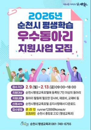 ¼øÃµ½Ã°¡ Áö¿ª»çȸ Æò»ýÇнÀ ¹®È È®»êÀ» À§ÇØ ¿À´Â 9ÀϺÎÅÍ 13ÀϱîÁö ¡®2026³â Æò»ýÇнÀ ¿ì¼öµ¿¾Æ¸® Áö¿ø»ç¾÷¡¯¿¡ Âü¿©ÇÒ µ¿¾Æ¸®¸¦ ¸ðÁýÇÑ´Ù°í ¹àÇû´Ù.