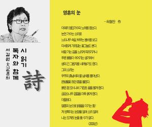 "´«¸Õ °¡¼ö´Â ¼Ò¸®·Î / ´ÀƼ³ª¹« ¼ÓÀÙ Æ·¿ì´Â º½ºñ¸¦ º¸°í / ¹Ì¼¼ÇÏ°Ô °¡¶ó¾É´Â ²É±×´Ãµµ º»´Ù" ¿ì¸®°¡ ÀÚÁÖ ¾²´Â 'º»´Ù'¶õ ¸»¿¡´Â º¸Åë µÎ °¡Áö ÇØ¼®ÀÌ ÀÖ´Ù. '¸öÀÇ ´«'À¸·Î º»´Ù¿Í '¸¶À½ÀÇ ´«'À¸·Î º»´Ù. ¿©±â¿¡ ÀÌ ½Ã´Â Çϳª¸¦ µ¡ºÙÀδÙ. '¼Ò¸®·Î º»´Ù'. ´«¸Õ °¡¼ö´Â ¼Ò¸®¸¦ ÅëÇØ "´ÀƼ³ª¹« ¼ÓÀÙ Æ·¿ì´Â º½ºñ"¿Í "¹Ì¼¼ÇÏ°Ô °¡¶ó¾É´Â ²É±×´Ã"À» º»´Ù. »Ó¸¸ ¾Æ´Ï´Ù. "¹Ù¶÷ °¡´Â ±æ"À» µû¶ó°¡±âµµ Çϰí "Ǫ¸¥ º°µéÀÌ ½¬¾î°¡´Â »ù°¡¿¡¼ »ýÀÇ ±ä ±×¸²ÀÚ¸¦ ³»·Á³õ´Â" ±×·± »îÀ» »ì¾Æ°¡±âµµ ÇÑ´Ù. "±×ÀÇ ¼Ò¸®´Â / ¿ìÁÖÀÇ È볿»õ¿Í ¹° ³¿»õ¸¦ »Õ¾î³½´Ù. / Àº¹æ¿ï²É ÇϾá Á¾À» ¿ï¸°´Ù. / ºÓÀº Á¡ ¸ð½Ã³ªºñ ±â¸°ÃÊ ²ÜÀ» »¡°Ô ÇÑ´Ù. / ±Ý°¼Ò³ª¹« ²®ÁúÀ» ´õ¿í ºÓ°Ô ÇÑ´Ù" '³²µµ ¼Ò¸®' ¿¬ÀÛÀÇ ÇÑ ÆíÀÇ ÀÛǰ °¡¿îµ¥ ¿µÈÈµÈ '¼ÆíÁ¦'°¡ µé¾î Àִµ¥, ´«¸Õ ¿©ÀÚ ¼Ò¸®²ÛÀÇ ¼Ò¸®¿¡ ÀÇÇØ ¼±Çе¿¿¡ ¼±ÇÐÀÌ ³¯¾Æ¿À¸£´Â Àå¸éÀ» Àå¾öÇÏ°Ô Ç¥ÇöÇÑ ÀÛǰÀÌ´Ù. ¼Ò¼³¿¡¼ ´À²¼´ø ¼Ò¸®ÀÇ ÈûÀ» ÀÌ °¡¼öÀÇ ³ë·¡¸¦ µéÀ¸¸ç ´À²¸º¸·Á ÇÑ´Ù.