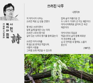 "¾²·¯Áø ³ª¹«ÀÇ Çâ±â¿Í / »ì¾Æ ÀÖ´Â ³ª¹«ÀÇ Çâ±â¸¦ ÇÔ²² ¸Ã´Â´Ù" ¾²·¯Áø ³ª¹«´Â ¿©Å±îÁö ÃÖ¼±À» ´ÙÇß´ø »îÀ̶ó¸é, »ì¾Æ ÀÖ´Â ³ª¹«´Â ÇöÀç ÃÖ¼±À» ´ÙÇØ »ì°í ÀÖ´Â Á¸ÀçÀÇ ¸ð½ÀÀÌ´Ù. ±×·¯±â¿¡ µÑÀÇ Çâ±â°¡ ºñ½ÁÇÏ´Ù. ¾Õ¼± ¼¼´ë°¡ Èû¿¡ ºÎÃÄ ¾²·¯Áö·Á ÇÒ ¶§ ´ÙÀ½ ¼¼´ë°¡ ¹öÆÀ¸ñÀÌ µÊÀº ³Ê¹«³ª ´ç¿¬ÇÑ ÀÏÀ̴ϱî. ¡°¾²·¯Áø ¾ÆÄ«½Ã¾Æ¸¦ / Á¦ ¸öÀ¸·Î ¹Þ¾Æ³½ ¶±°¥³ª¹«, / »ç¶÷ÀÌ »ç¶÷À» / ±×ó·³ ¿À·¡ ²¸¾ÈÀ» ¼ö ÀÖÀ¸·ª¡±