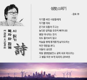 ½ÃÀÎÀº ¸ñµ¿¿¡ ÀÖ´Â ¿º´ÇÕ¹ßÀü¼Ò¿¡¼ ¾²·¹±â¸¦ Å¿ö Àü±â¸¦ ¸¸µé ¶§ Çϴ÷Πġ¼Ú´Â ÇÏ¾á ¿¬±â¸¦ º¸°í ½Ã °¨(ãÌÊï)À» Àâ¾Ò´Ù. ¸ñµ¿ ¿º´ÇÕ¹ßÀü¼Ò °Ç¸³ ´ç½Ã¸¸ ÇØµµ Áö¿ªÀ̱âÁÖÀǰ¡ ³Á¦·Î ¶°¿À¸£Áö ¾Ê¾Ò´Â°¡ º¸´Ù. ½ÃÀÇ ±Û°¨Àº ¡®¾²·¹±â¡¯Àε¥, °Å±â¿¡ ¡®¼º(á¡)¡¯ÀÌ ºÙ¾ú´Ù. ¾Æ½Ã´Ù½ÃÇÇ ¡®¼ºÀÎ(á¡ìÑ)¡¯, ¡®¼ºÇö(á¡úç)¡¯ ÇÒ ¶§ ¾²´Â ¡®á¡¡¯Àº ÀÚ½ÅÀ» Èñ»ýÇÏ¿© ¼Ò¿Ü¹Þ°í °íÅë¹Þ´Â À̵éÀ» À§ÇØ ÀÏ»ýÀ» Çå½ÅÇÏ¿© »ì¾Æ¿Â »ç¶÷À» °¡¸®Å³ ¶§ ¾²´Â ¸»ÀÌ´Ù.