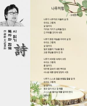 ÇÑ ¾ËÀÇ ¾¾¾ÑÀÌ ¶³¾îÁ® Á×Áö ¾ÊÀ¸¸é ÇÑ ¾Ë ±×´ë·Î ÀÌÁö¸¸ Á×À¸¸é ¸¹Àº ¿¸Å¸¦ ¸Î´Â´Ù´Â Áø¸®¸¦ Àß ¾Ë±â ¶§¹®ÀÌ´Ù. ½ÃÀÎÀº ¿ì¸®¿¡°Ô ³ª¹«Ã³·³ »ì¶ó°í °¡¸£Ä¡°í ÀÖ´Ù. ³ª¹«°¡ ³ª¹«³¢¸® ¾î¿ï·Á »ì µíÀÌ, ¹àÀº ÇÏ´ÃÀ» ÇÔ²² ¿ì·¯·¯ º¸¸ç »ì µíÀÌ, ºñ¹Ù¶÷ ¼Ó¿¡¼µµ ÀÙÀ» ²ÉÀ» ¿¸Å¸¦ ¸ÎµíÀÌ, ±×¸®°í öÀ» ºÐº°Çϵí ÀÚ½ÅÀ» ÁöŰ¸ç »ì¶ó°í ³ª¹«´Â ±×·¸°Ô ¿ì¸®¿¡°Ô ¸¹Àº °ÍÀ» ÀÏ·¯ÁØ´Ù. ƯÈ÷ À±¼®¿ ´ëÅë·ÉÀ» ºñ·ÔÇÑ ÀÛ±ÝÀÇ Á¤Ä¡Àε鿡°Ô...