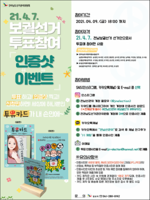 Àü¶ó³²µµ¼±°Å°ü¸®À§¿øÈ¸´Â 2021. 4. 7.(¼ö) ½Ç½ÃÇÏ´Â Àü¶ó³²µµÀÇȸÀÇ¿øº¸±È¼±°Å(¼øÃµ½ÃÁ¦1¼±°Å±¸)¿¡¼ ÅõÇ¥Âü¿© ÀÎÁõ¼¦ À̺¥Æ®¸¦ ½Ç½ÃÇÑ´Ù°í ¹àÇû´Ù.